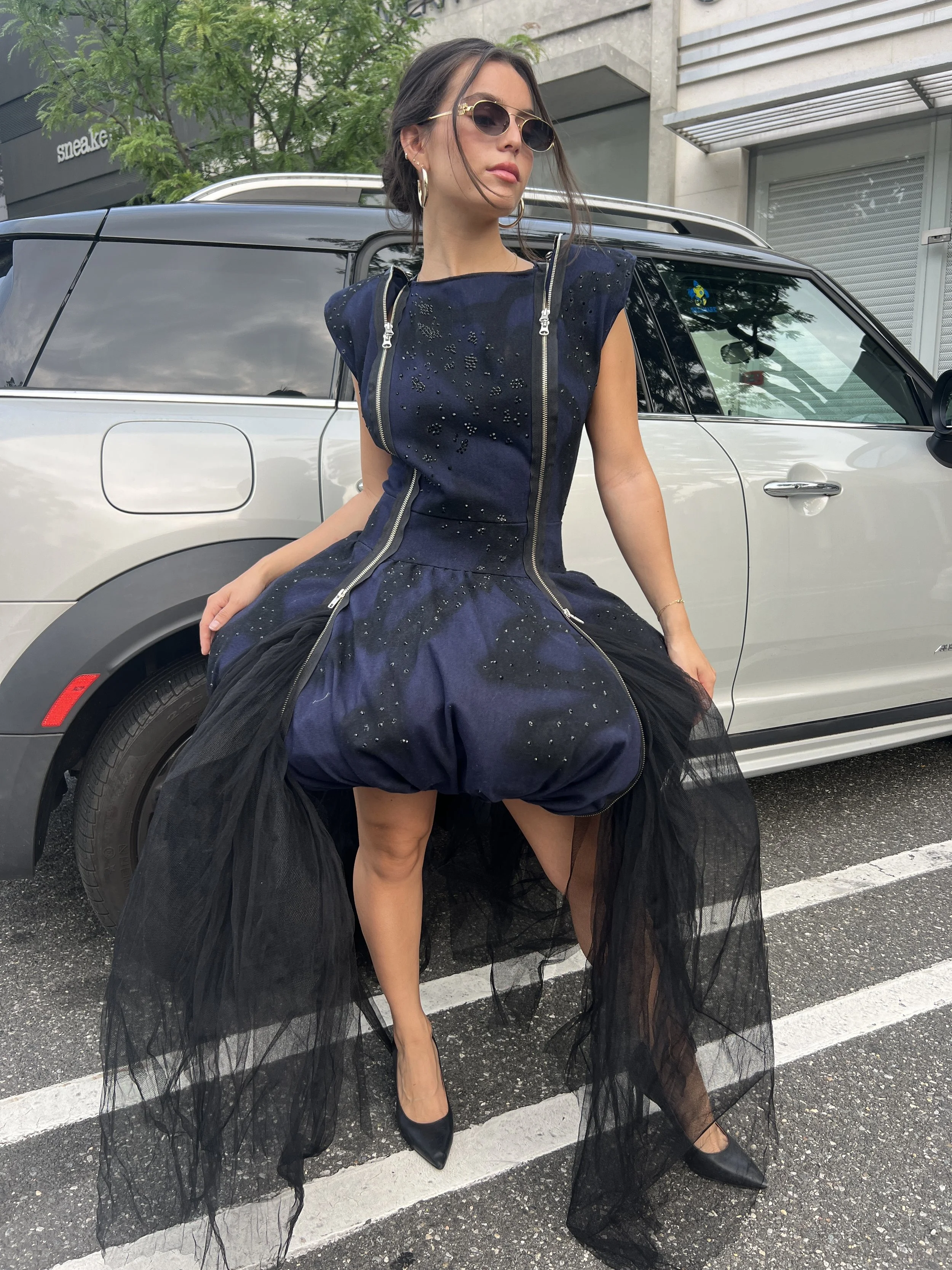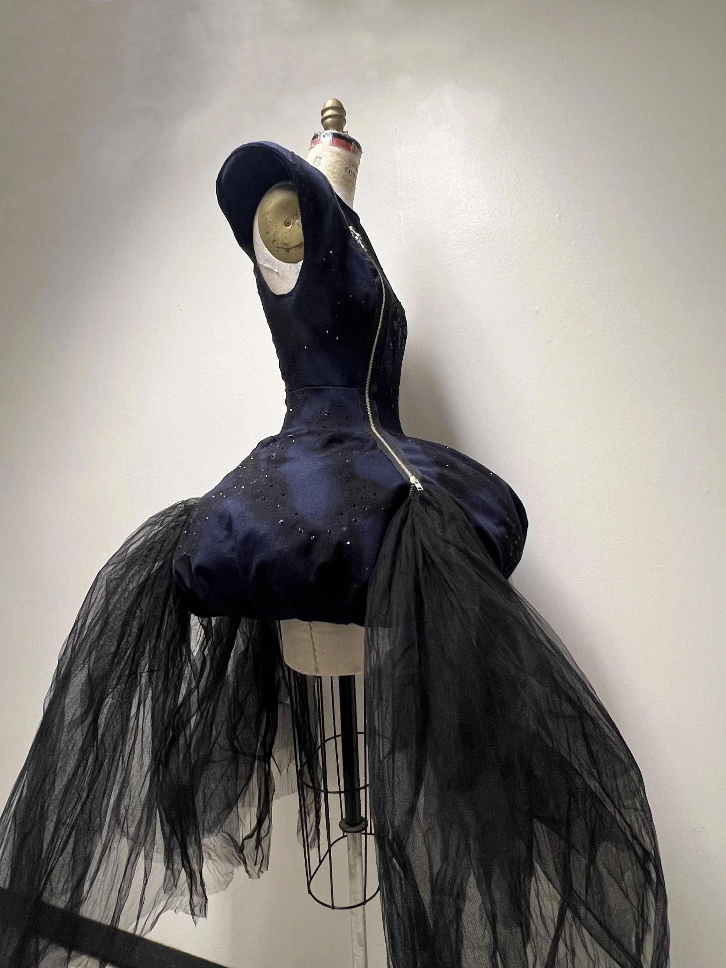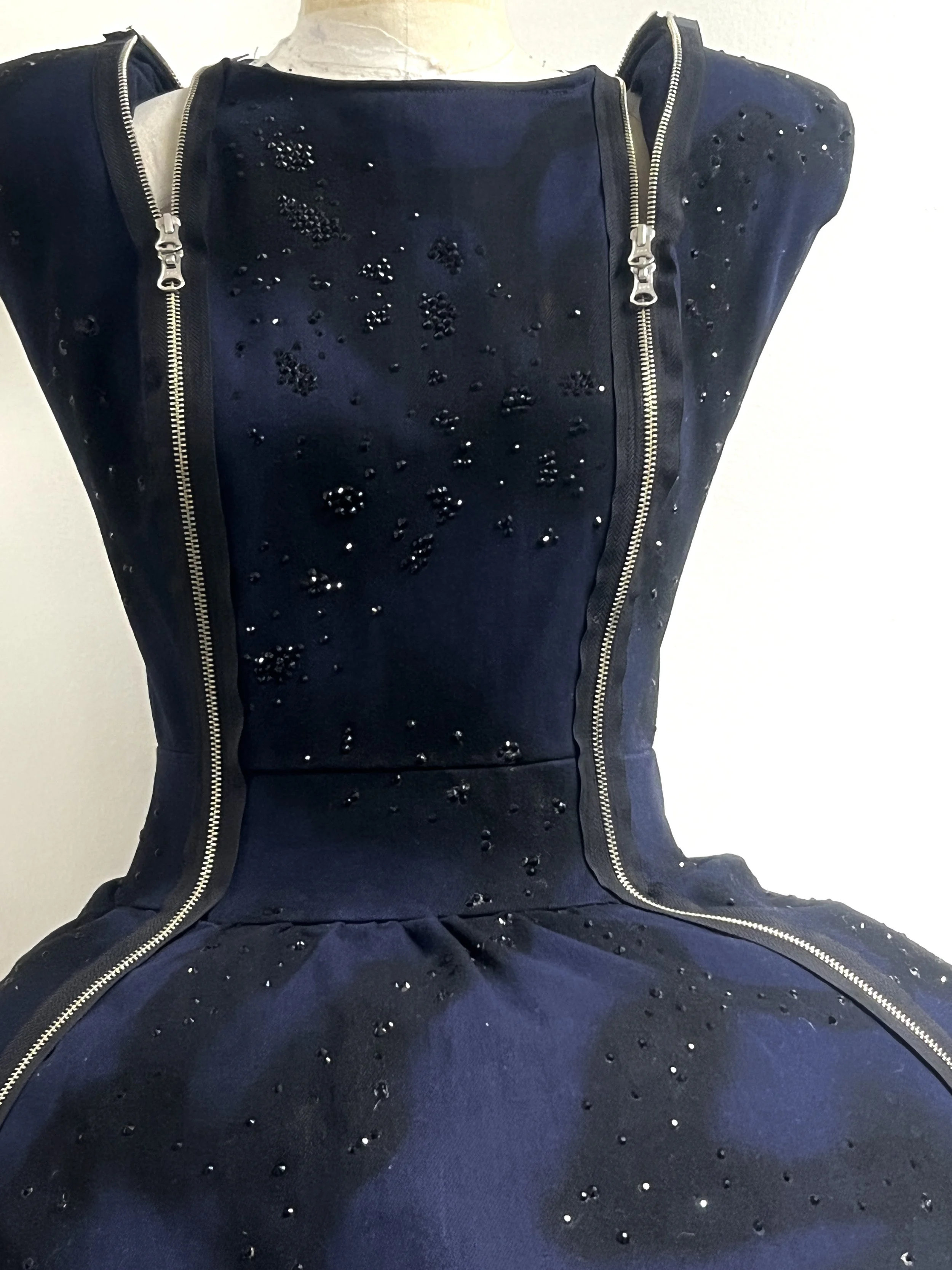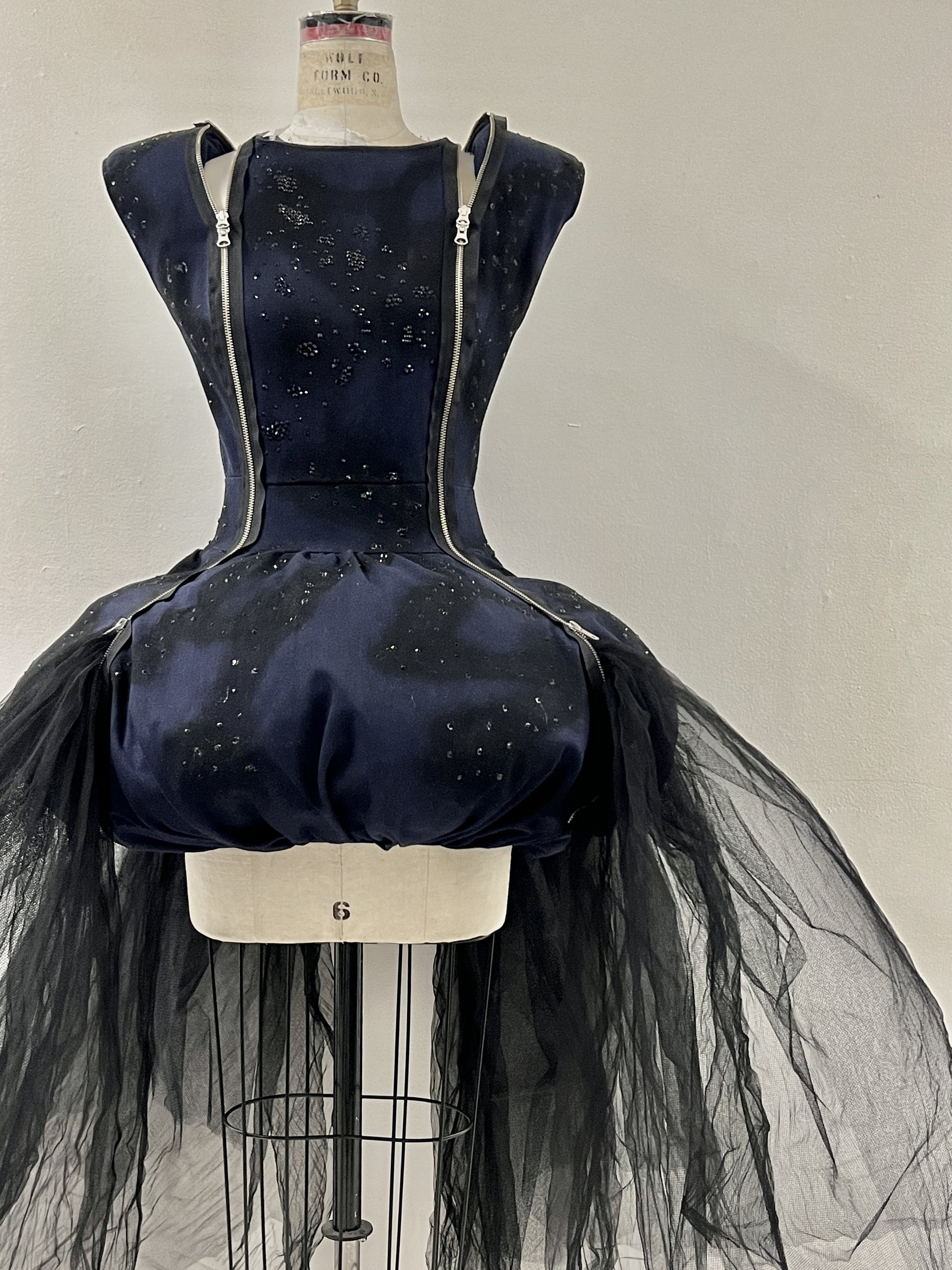 The dress "Baggage" is part of a capstone project from the Fashion Institute of Technology, themed "Divine Denim." It features a functional skirt bag with four-way zippers on the front and back panels. This innovative design symbolizes the emotional and physical baggage we carry daily, blending practicality with a meaningful concept.