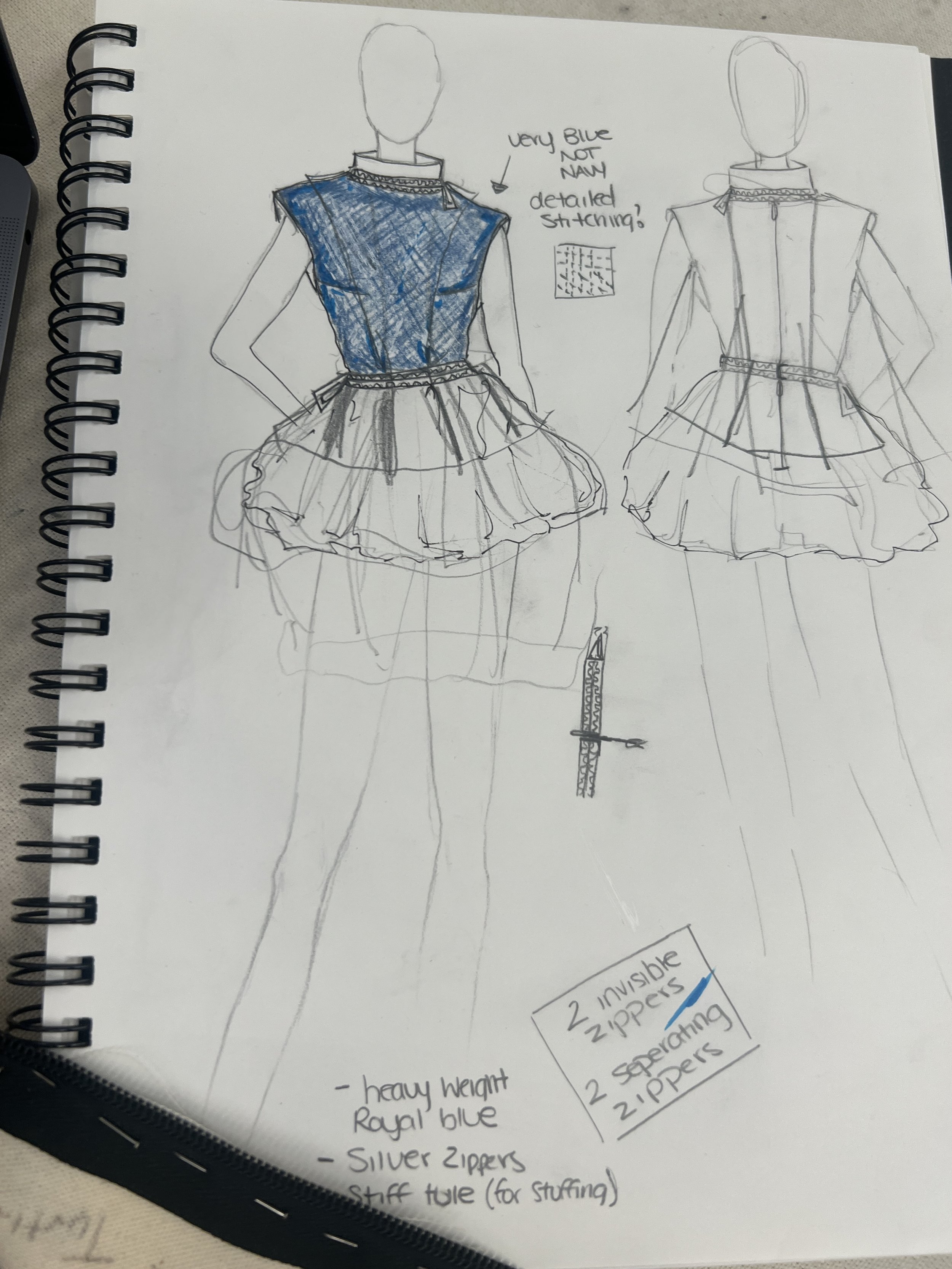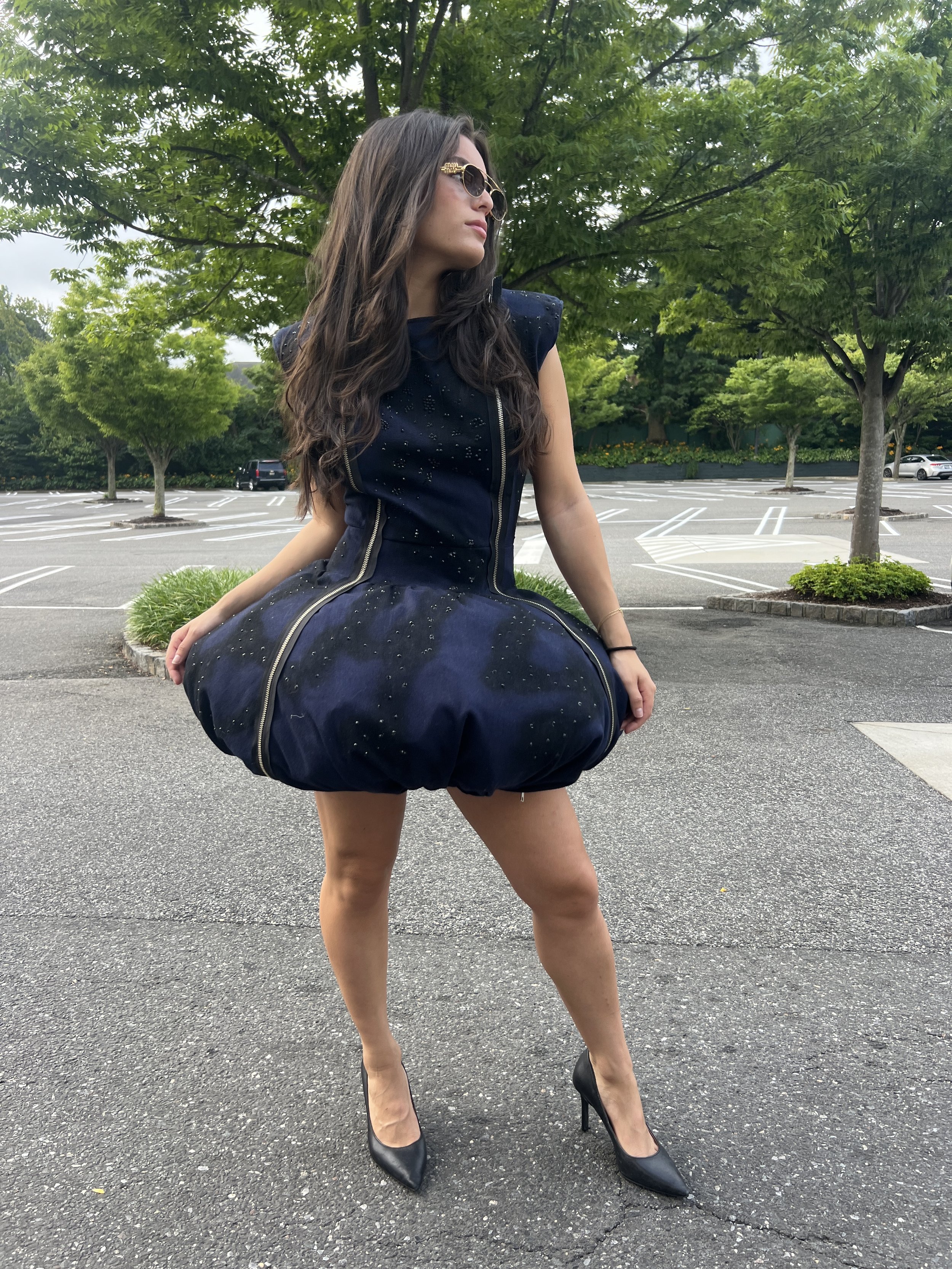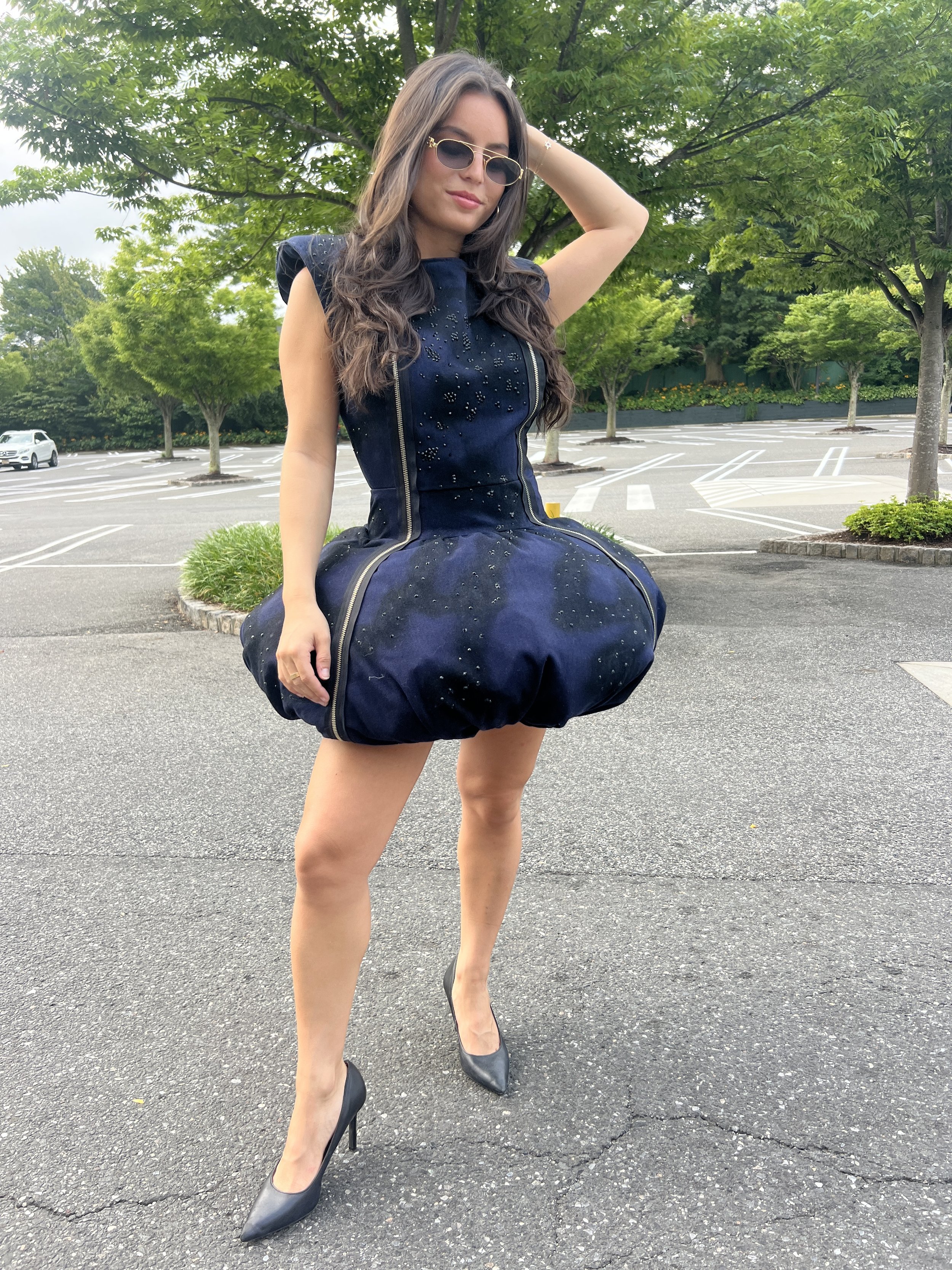 The dress "Baggage" is part of a capstone project from the Fashion Institute of Technology, themed "Divine Denim." It features a functional skirt bag with four-way zippers on the front and back panels. This innovative design symbolizes the emotional and physical baggage we carry daily, blending practicality with a meaningful concept.