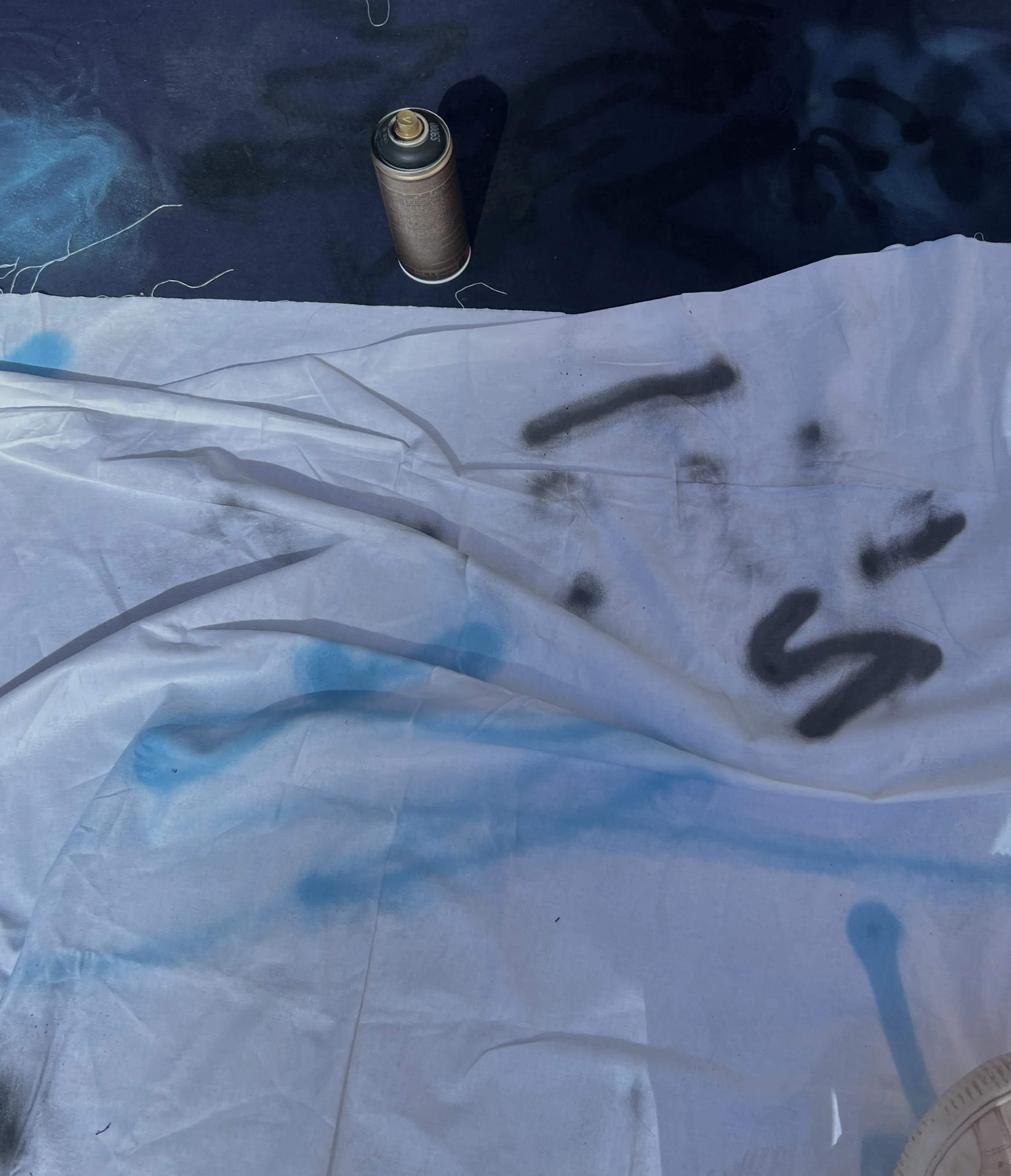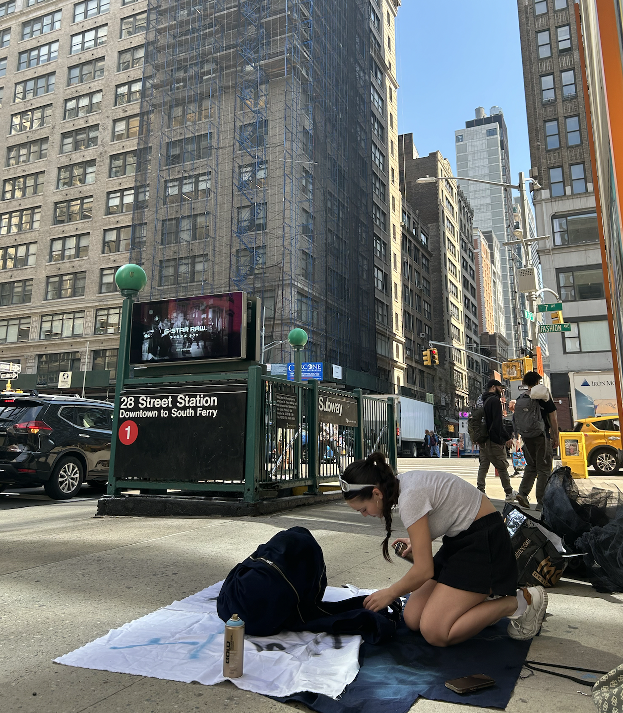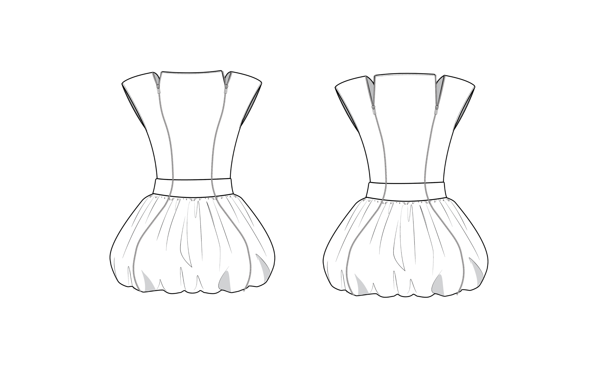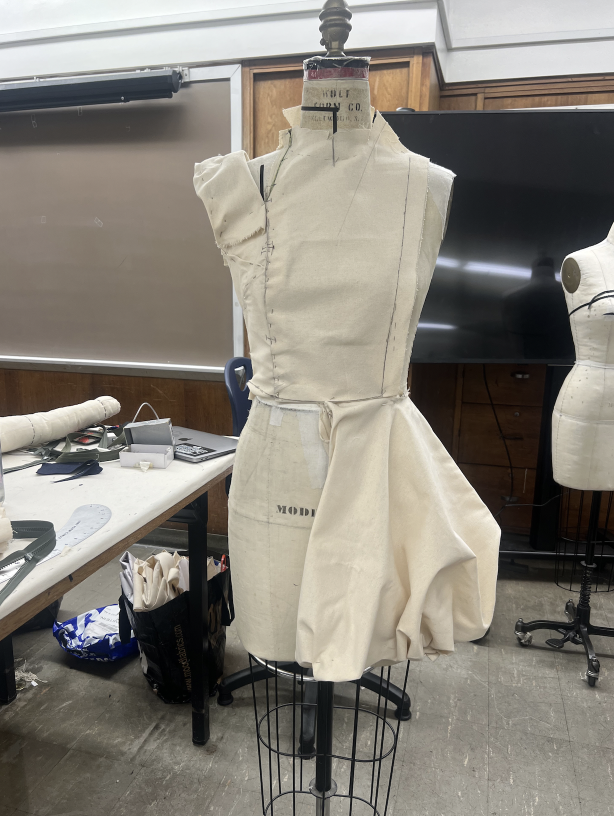 The dress "Baggage" is part of a capstone project from the Fashion Institute of Technology, themed "Divine Denim." It features a functional skirt bag with four-way zippers on the front and back panels. This innovative design symbolizes the emotional and physical baggage we carry daily, blending practicality with a meaningful concept.