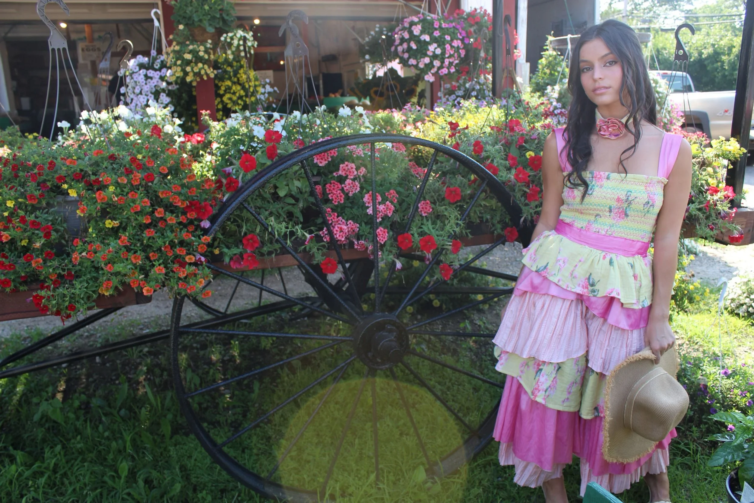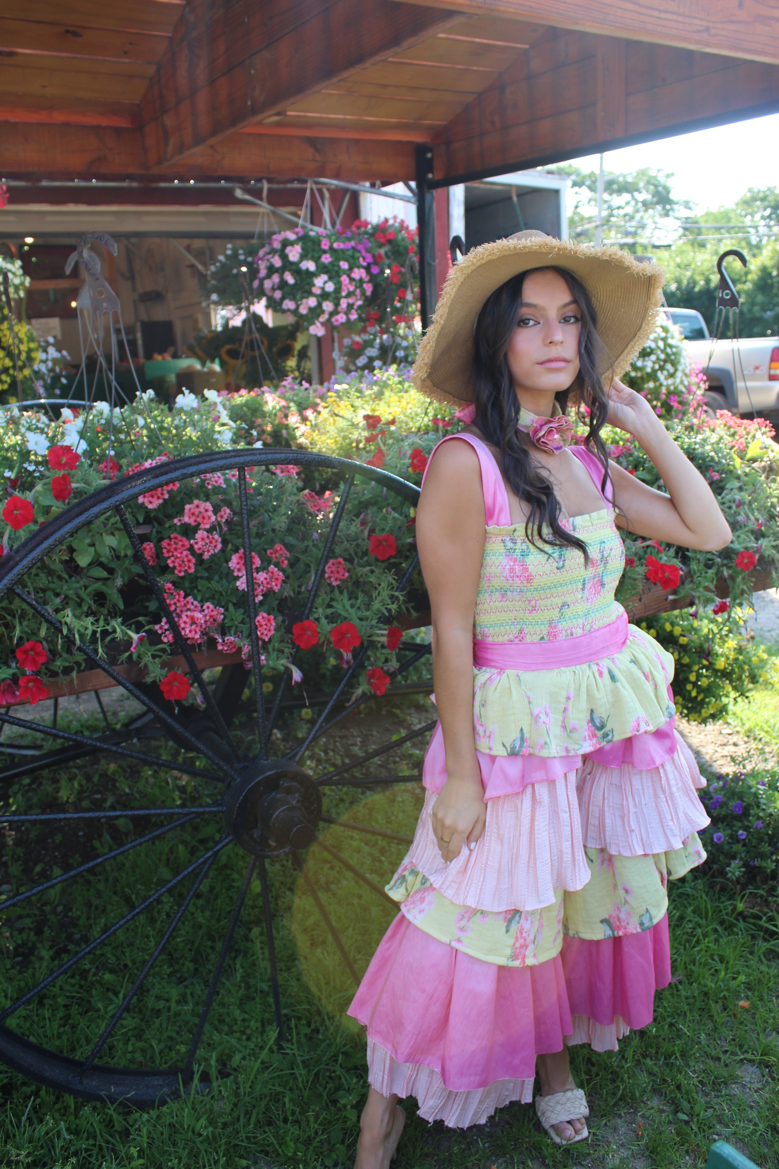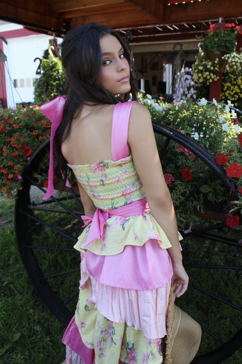 This garden-inspired jumpsuit, made from upcycled fabrics, blends whimsy and femininity with a focus on sustainability.