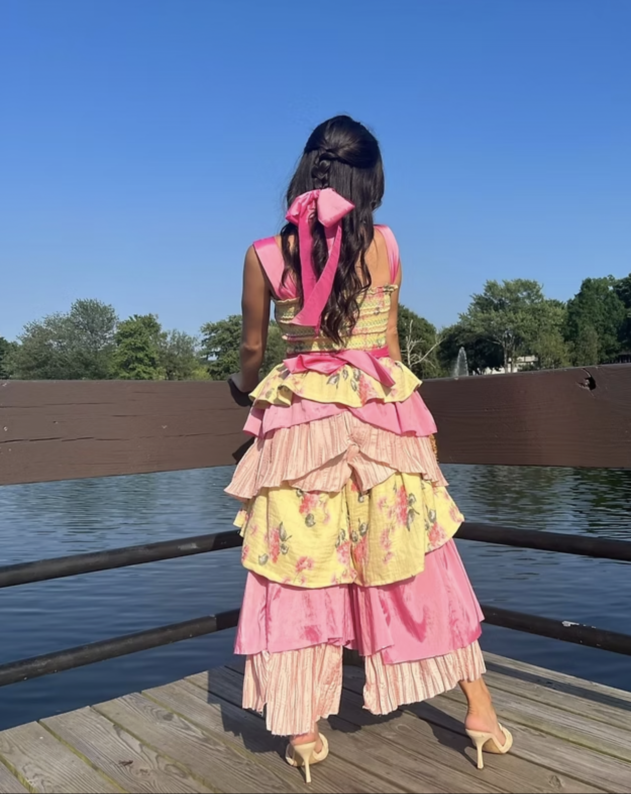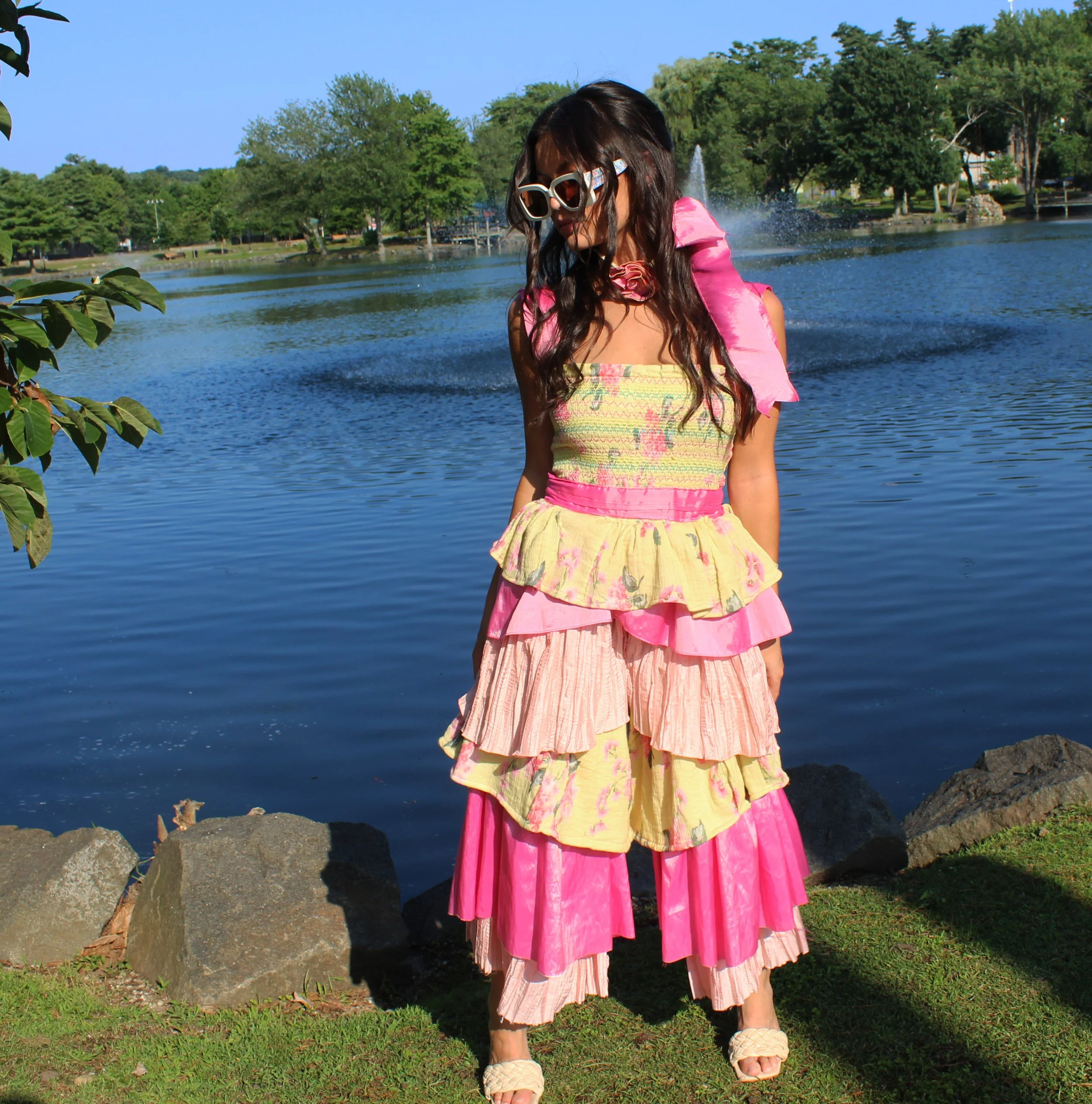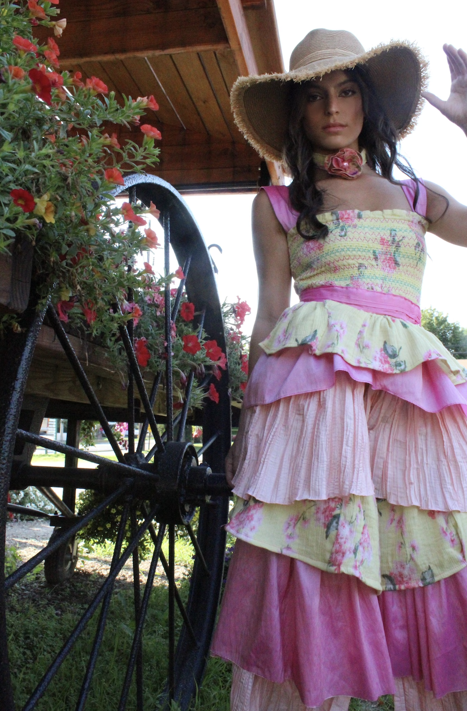 This garden-inspired jumpsuit, made from upcycled fabrics, blends whimsy and femininity with a focus on sustainability.
