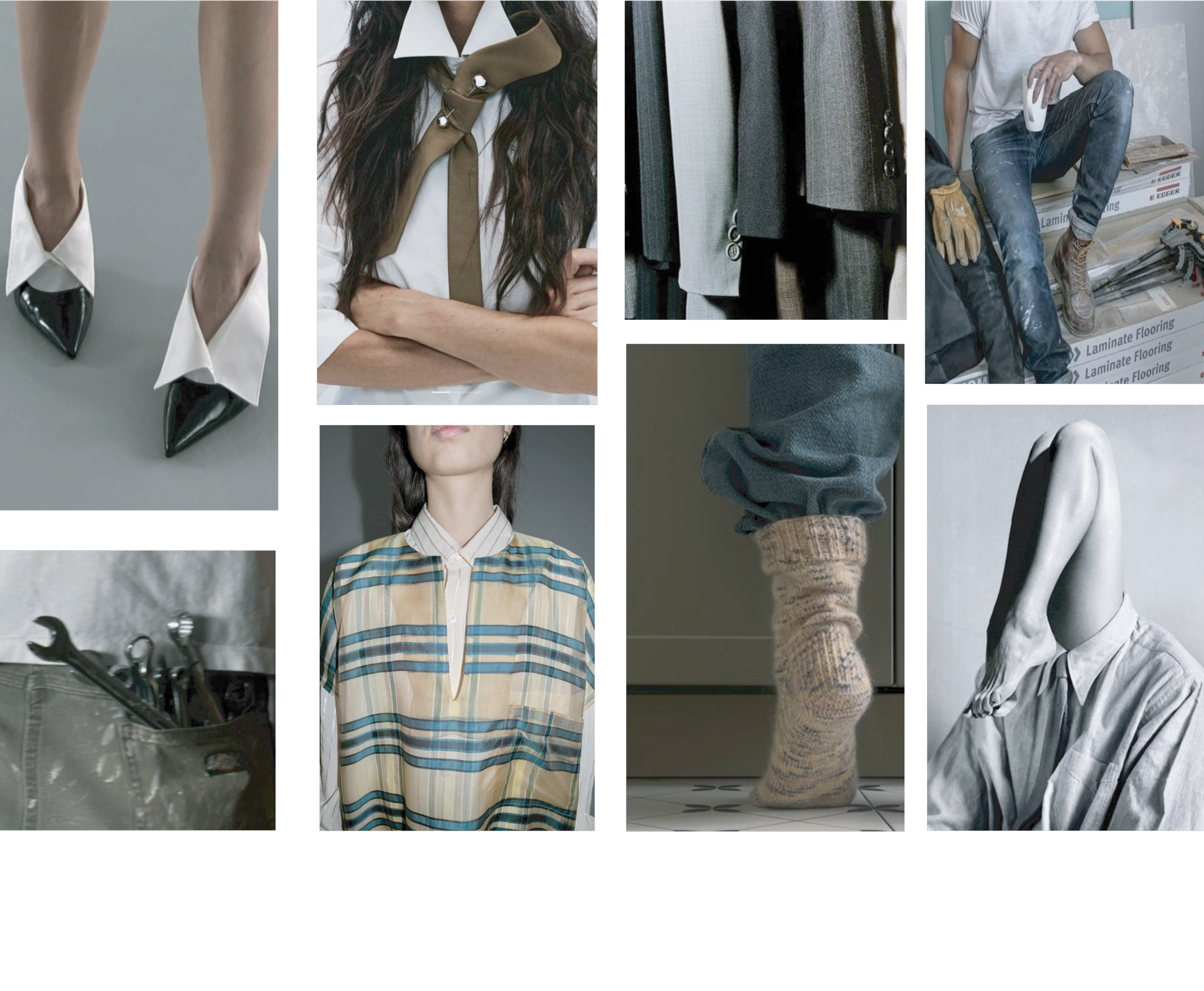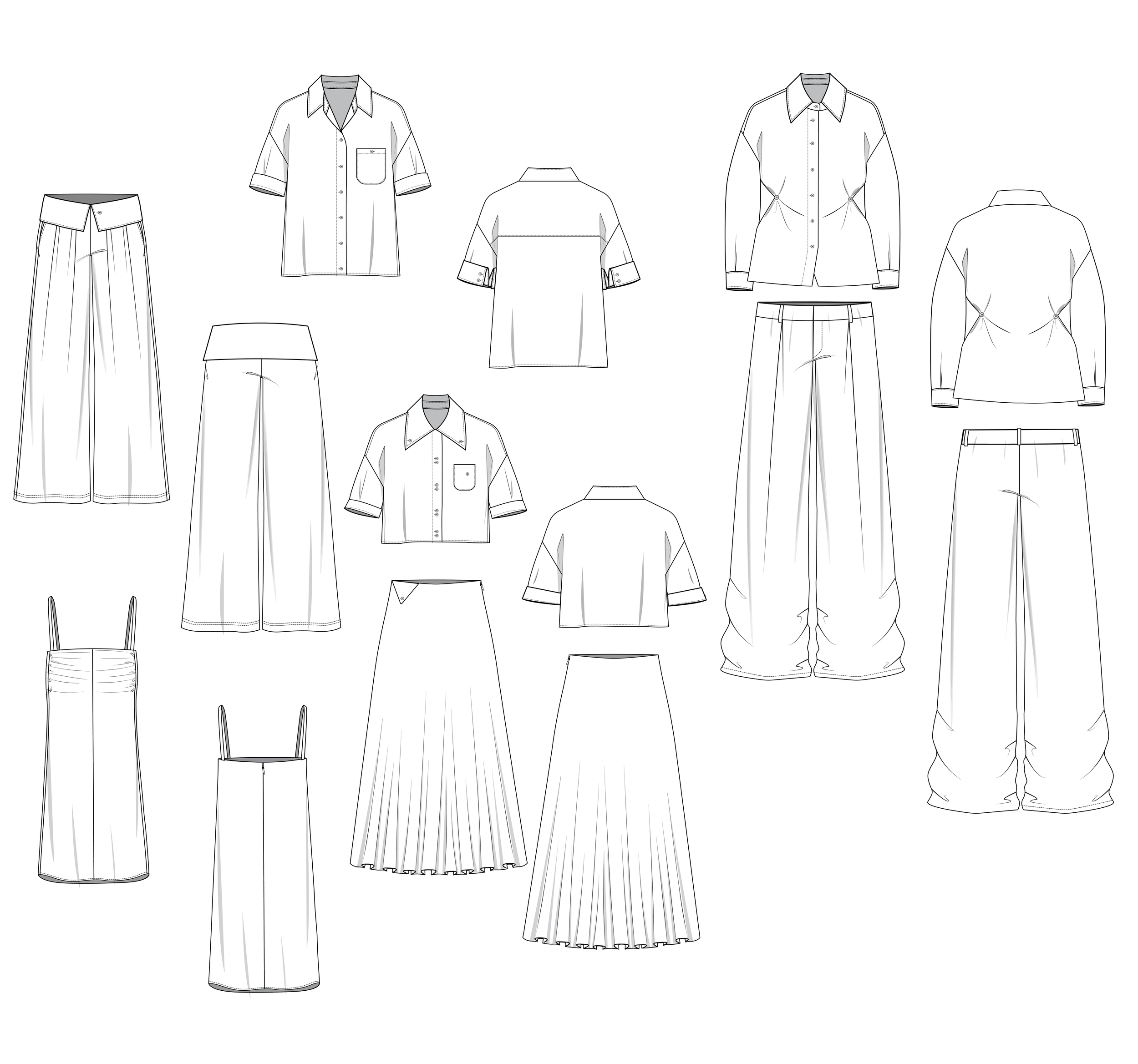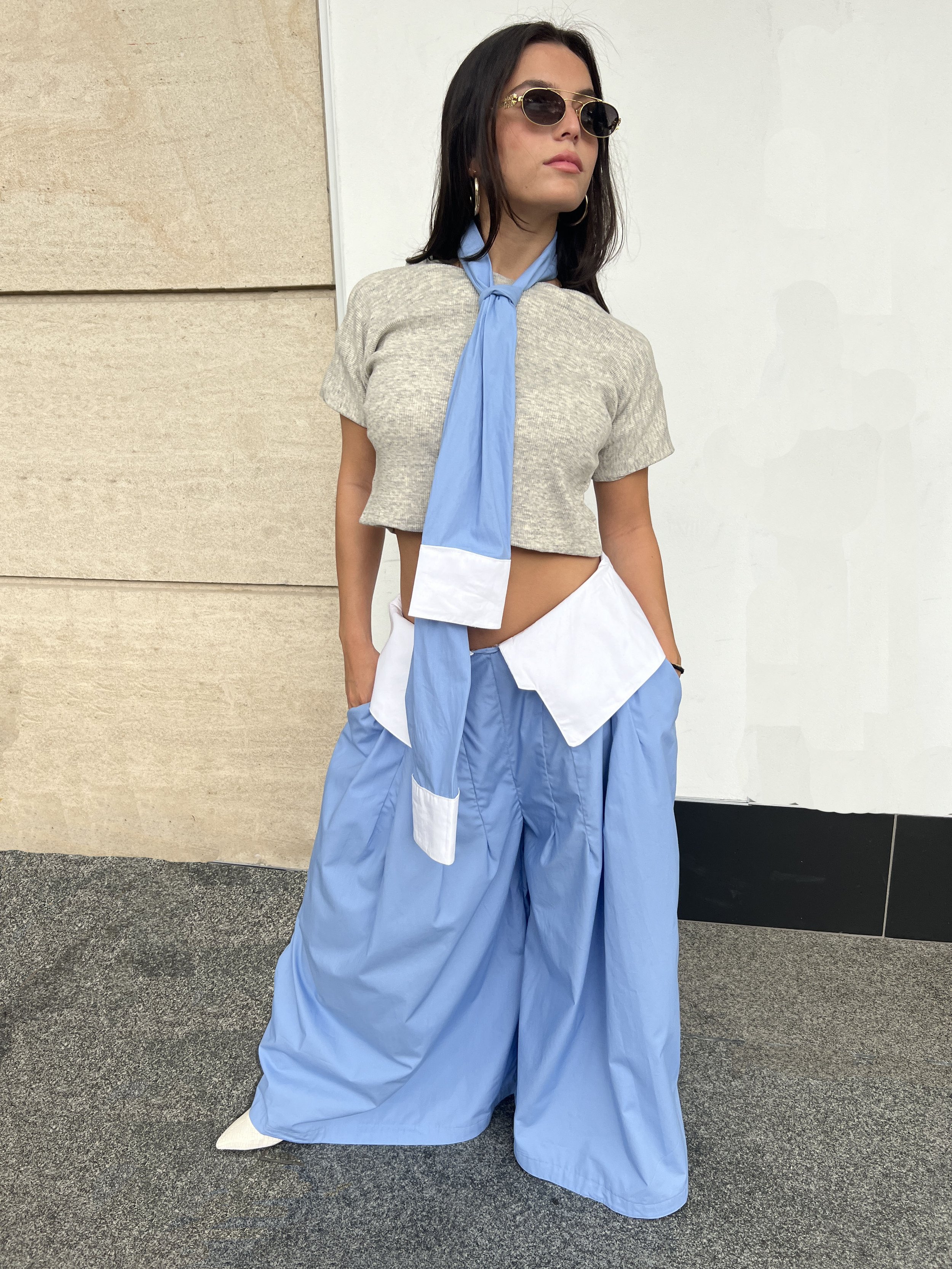 This design creatively merges elements of a sock and a button-down shirt. The "sock" is reimagined as a ribbed knit turtleneck, while the "collared shirt" takes the form of pants with a collar waistband. A long sleeve panel serves as a "tie", functioning as both a belt and a scarf. The concept was developed through draping, patternmaking, and sewing, showcasing a unique blend of traditional clothing elements in an innovative way.