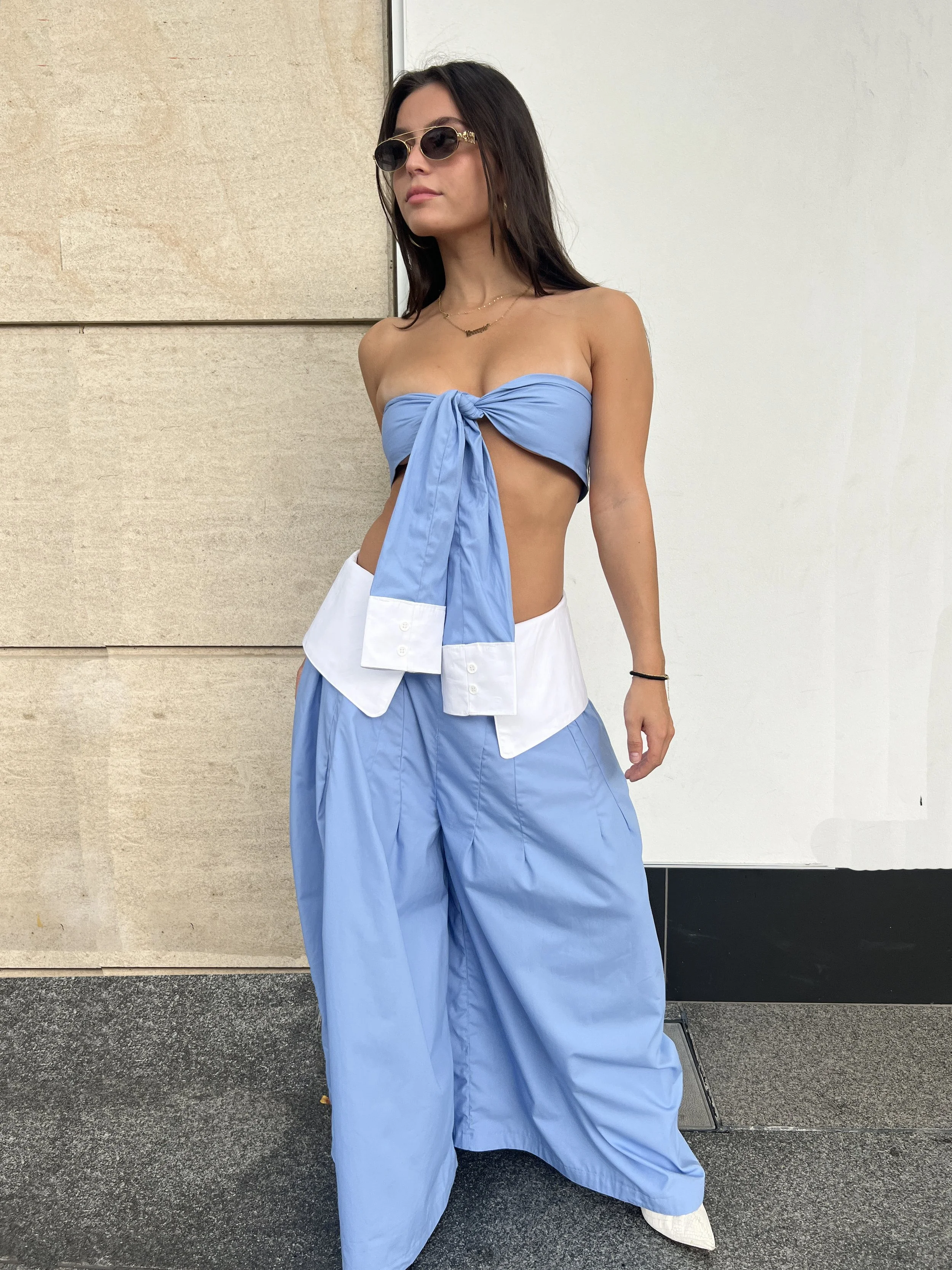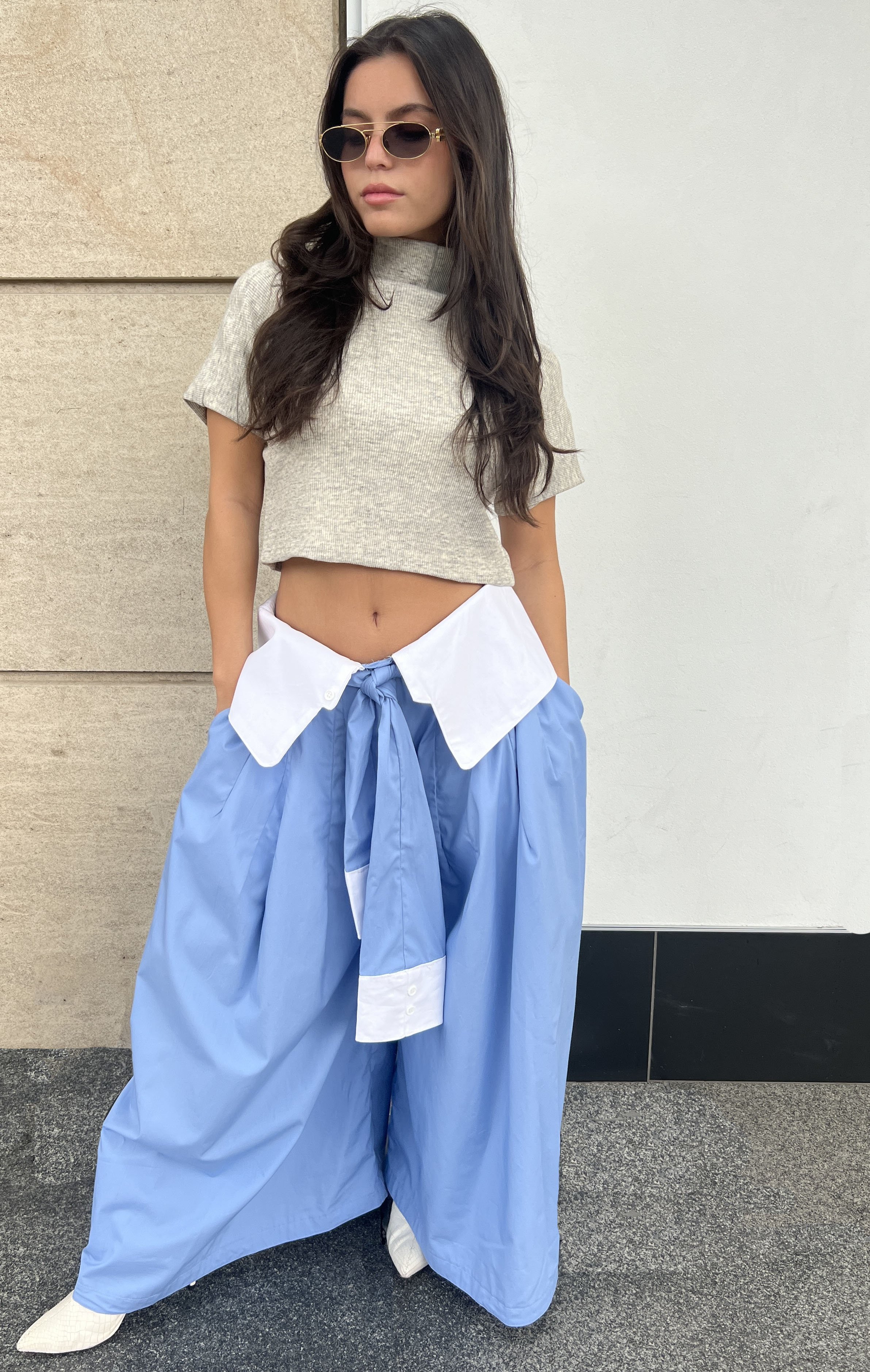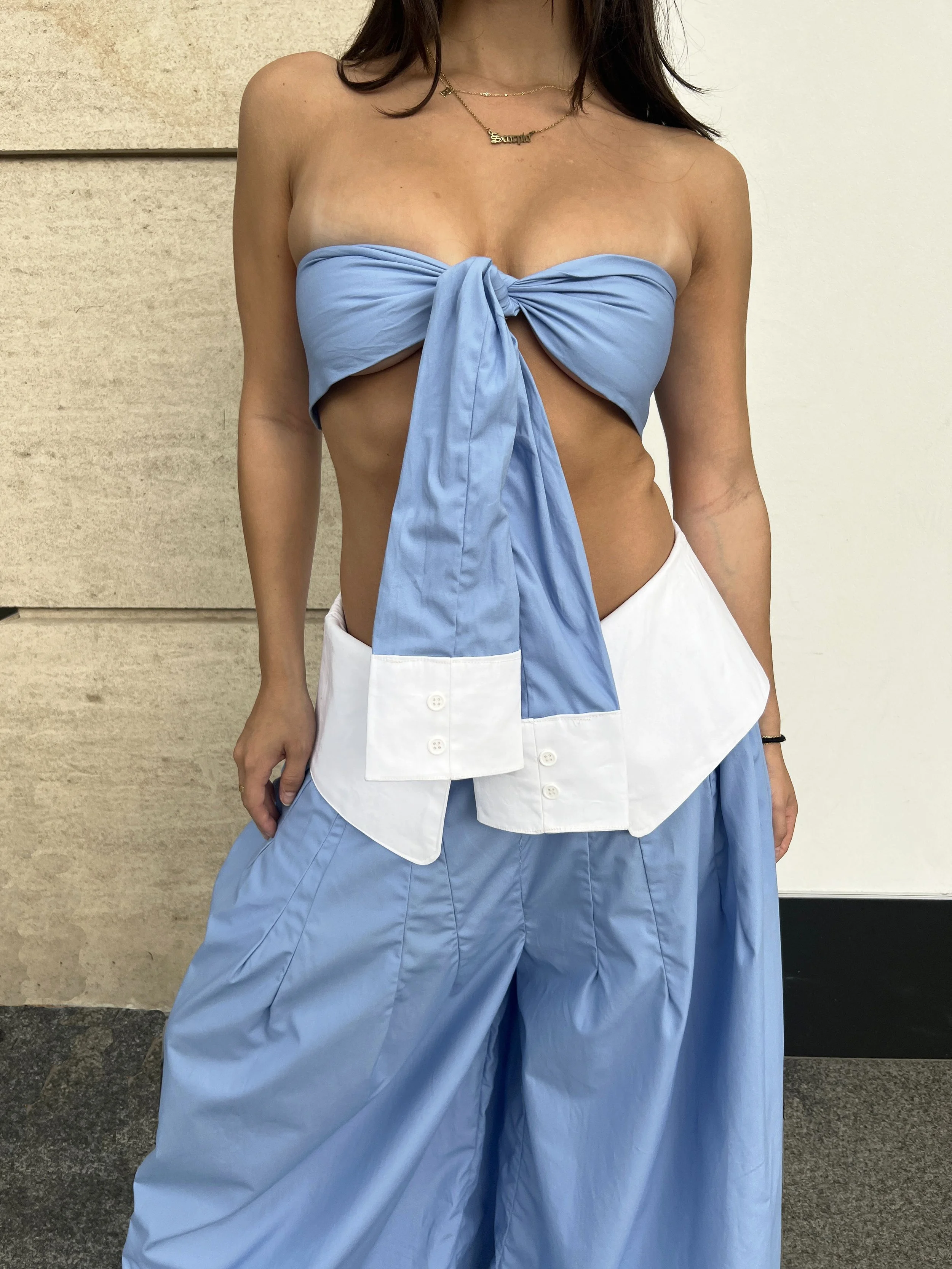 This design creatively merges elements of a sock and a button-down shirt. The "sock" is reimagined as a ribbed knit turtleneck, while the "collared shirt" takes the form of pants with a collar waistband. A long sleeve panel serves as a "tie", functioning as both a belt and a scarf. The concept was developed through draping, patternmaking, and sewing, showcasing a unique blend of traditional clothing elements in an innovative way.
